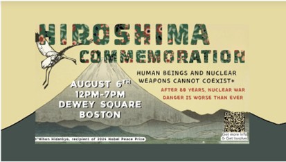 For the 80th anniversary of the U.S. atomic bombing of Hiroshima, the Boston-Hiroshima 80th Anniversary Commemoration Coalition prepared a 70-minute video for repeated display during a major commemoration held on August 6th at Dewey Square in downtown Boston. In three sections it addresses: the meaning of August 6, 1945; the legacy of the hibakusha (survivors of the atomic bombings of Hiroshima and Nagasaki); and a plea for disarmament. Please learn from and circulate this unique resource. In conjunction with the August 6th event, on August 4th the coalition ran a full-page signature ad in the Boston Globe, commemorating with sorrow and regret the Hiroshima and Nagasaki bombings, with more than 250 people listed, from across Massachusetts and beyond. The commemoration concluded with an August 9th Nagasaki anniversary lantern float in Watertown, MA.