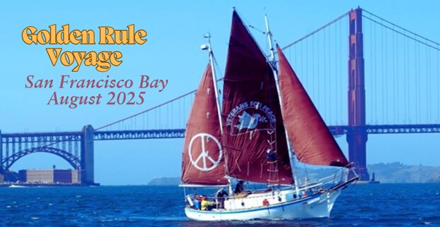 The original nuclear protest boat, the Golden Rule, is sailing again to promote a nuclear free future, to educate about the dangers of radiation to humanity and the environment, and to support peaceful alternatives to war. In 1958, anti-nuclear weapons activists set sail aboard her to protest U.S. atmospheric testing of nuclear weapons in the Marshall Islands. In 2010 Veterans For Peace discovered and began restoring the boat, which had been abandoned in Humboldt Bay, and have been sailing to promote peace since 2015. The Golden Rule is now wrapping up her August 2025 San Francisco Bay Voyage, which included speaking at the Hiroshima day commemoration at the Livermore Nuclear Weapons Lab, premiering a new documentary, Golden Rule: The Journey for Peace, sailing, and doing media and educational events with groups around the Bay area. Read more.