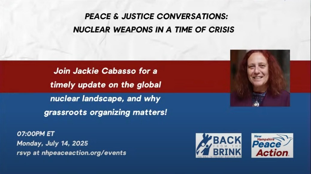 Webinar Recording: Nuclear Weapons in a Time of Crisis; Why Local Actions Matter, July 14, 2025 As global tensions rise and nuclear risks grow, it's more important than ever for local communities to engage in the movement for nuclear disarmament. On July 14, 2025,Western States Legal Foundation Executive Director and UFPJ National Co-convener Jackie Cabasso joined New Hampshire Peace Action to explore the current state of nuclear weapons policy, the urgent need for action, and how local advocacy efforts — like those supported byMayors for Peace and the Back from the Brink campaign -- are making a difference. Jackie provided a timely update on the global nuclear landscape, then shifted to a conversation about why grassroots organizing matters and how individuals and communities can get involved. Watch the webinar recording.