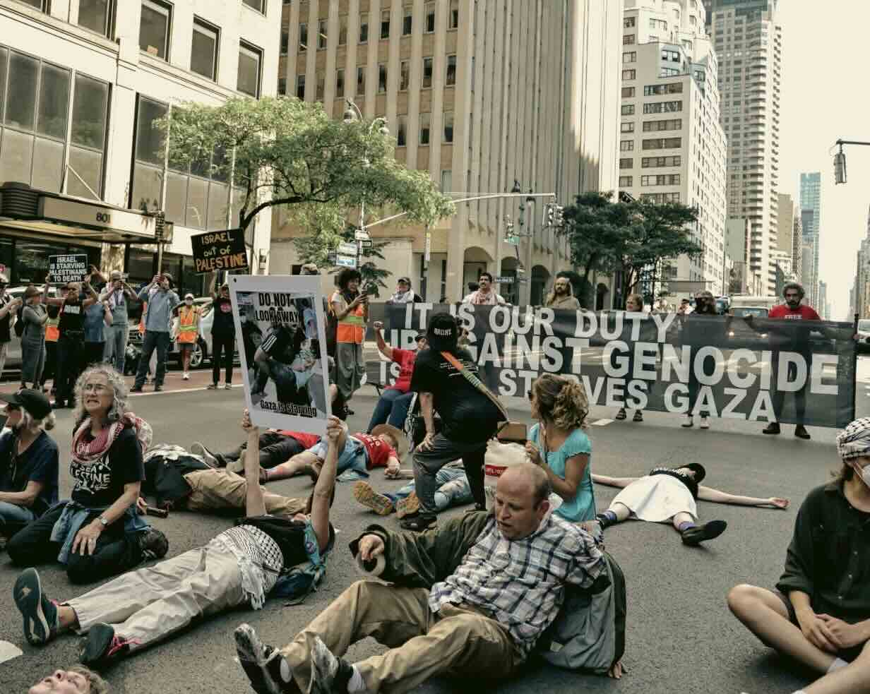 Veterans for Peace 40-Day Fast for Gaza Veterans for Peace and alliesfasted for Gaza for 40 days in front of the US Mission to the UN. It was a motley crew of angels including veterans from Vietnam, Iraq and other wars. One had just been hospitalized for side effects of fasting. Another had arrived from the Global March to Gaza. Another was writing a thesis on starvation as a weapon of war. Many stopped to express solidarity and 792 people joined the fast from around the country. Their demands: Resume humanitarian aid and stop arming Israel NOW! On June 30th, the last day, 29 were arrested for blocking traffic with a die-in in front of the Israeli Mission. Mike Ferner threw cow blood on the U.S. Mission saying, "It's about time the U.S. Government show some of the blood on its hands that it is shedding all over the world."