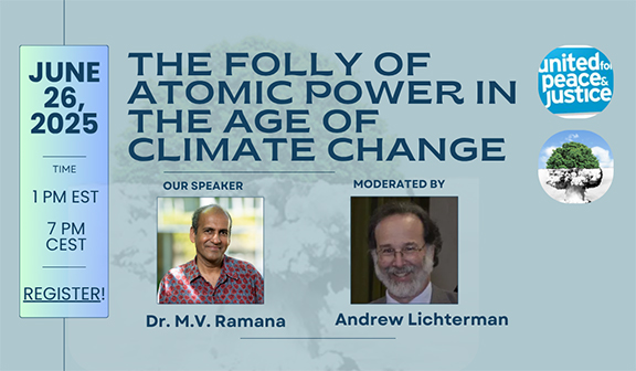 Webinar Recording: "The Folly of Atomic Power in the Age of Climate Change," June 26, 2025 Advocates of nuclear power argue that climate change mitigation is a reason to build a new generation of nuclear power plants, which they claim will provide safe, clean, and cheap electricity. This webinar featured Dr. M.V. Ramana, author of Nuclear is Not the Solution: The Folly of Atomic Power in the Age of Climate Change. He discussed industry claims that, this time, they will be able to build safe, reliable nuclear plants that can generate electricity at competitive prices, and the political and economic alliances that have kept the nuclear industry afloat despite nearly seven decades of unfulfilled promises. The webinar was presented by the Coordinating Committees of the Abolition 2000 Global Network to Eliminate Nuclear Weapons and United for Peace and Justice. Watch the webinar here; it begins at the 1:15 minute mark.