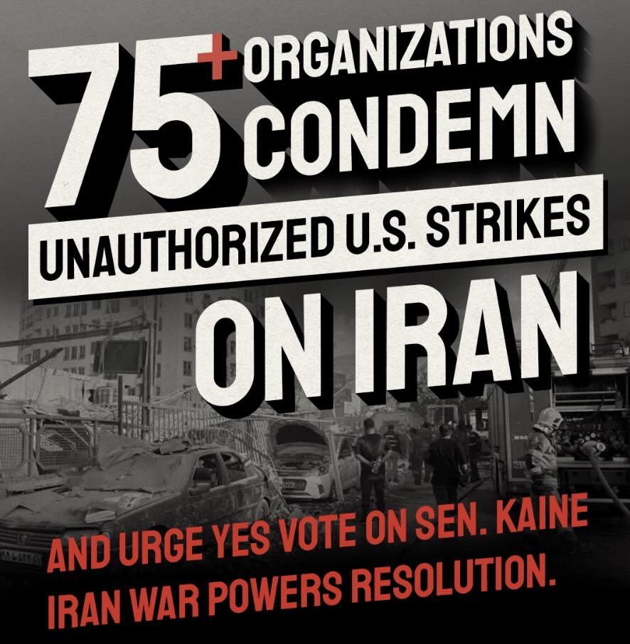 President Trump's decision to bomb Iran drew unequivocable condemnation across the UFPJ network. Veterans For Peace: "June 21, 2025 will be remembered as the day the U.S. once again chose war over diplomacy, unleashing consequences we may come to regret." Massachusetts Peace Action: "A war with Iran will be dangerous for all those involved and... endangers people across the region and American service members... deployed there." September 11th Families for Peaceful Tomorrows: "As relatives of those killed in the 9/11 terrorist attacks, [our members] have learned a great deal about trying to end terrorism with war. IT DOES NOT WORK." Campaign for Peace, Disarmament and Common Security: "The bombings were gross violations of international law. They undermine the Nuclear Nonproliferation Treaty and the increasingly fragile post WWII United Nations charter." Institute for Policy Studies: "We need to demand that the U.S. government pulls back its military, pursues diplomacy, and respects international law, human rights and equality for all."UFPJ member organizations joined scores of civil society organizations demanding Congressional action to end all illegal and unauthorized offensive military attacks against Iran.