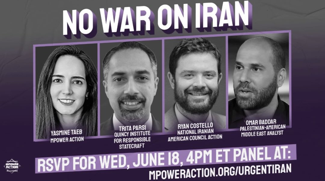 An emergency briefing "No War On Iran,"on June 18, just days before the U.S. bombed Iran did not prevent U.S. military action, but the experts' analysis of the issues at stake and the path to a stable international agreement are well worth listening to as the international community seeks peace, disarmament and security for all in Iran and throughout the Middle East. The webinar, moderated by Yasmine Taeb, of MPower Change, included Trita Parsi, an Iranian-born writer, activist, and executive vice president of the Quincy Institute for Responsible Statecraft; Ryan Costello, Policy Director at the National Iranian American Council, and Omar Baddar, a Palestinian American progressive political analyst, member of the National Policy Council of the Arab American Institute, and human rights advocate. WATCH HERE.